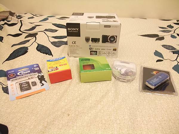 打開後馬上清點這次的禮物包:記憶卡,清潔組,UV護目鏡,32G記憶卡,電池,小腳架