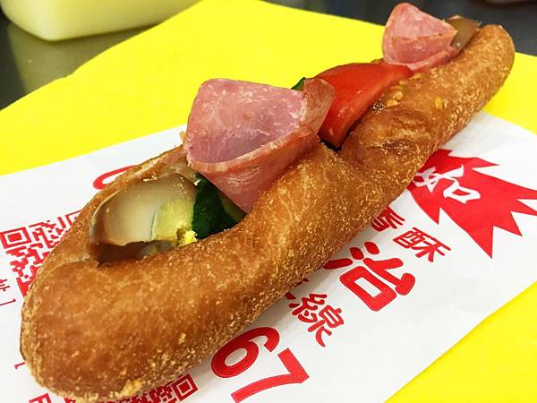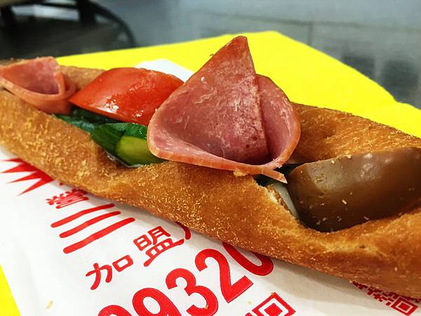 酥炸的口感大口咬下去可以一同連火腿片和小黃瓜和麵包一起吃~