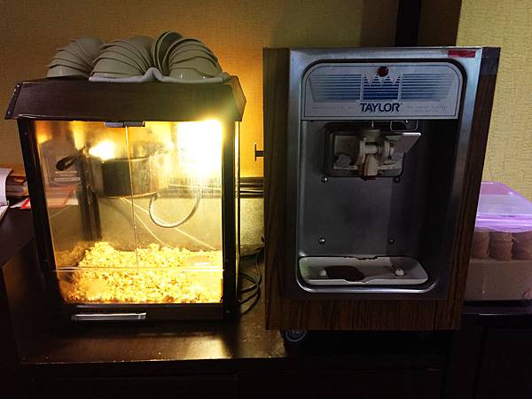 咖啡機旁邊則是爆米花和霜淇淋機 ,真棒,可以無限享用。