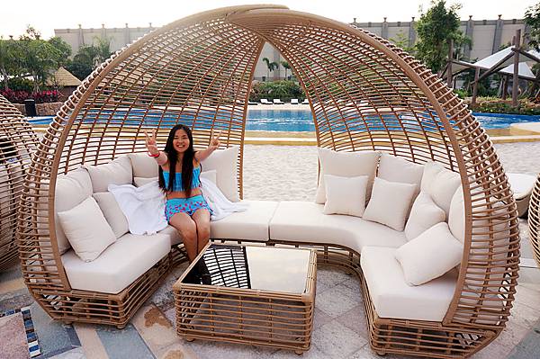 游泳池的兩側休息沙發椅,超新超大超舒服,可以躺