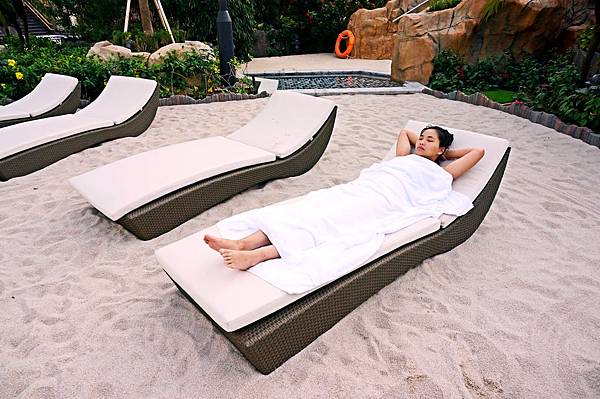 游了幾趟熱身之後,泳池的後方還有日光浴沙灘休息區,不太會游泳的女王