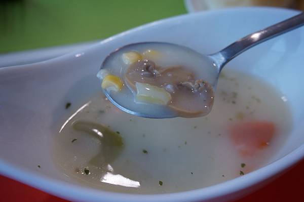 濃湯裡有蘑菇、玉米、紅蘿蔔,味道普普,雖沒有很大的特色,但不難喝,是個中庸湯品。