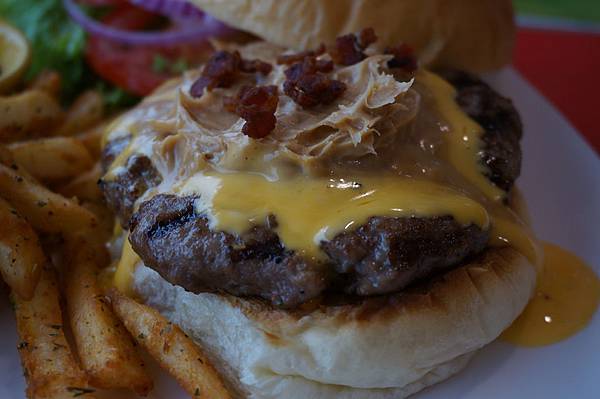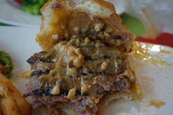 【花生John漢堡】使用手工漢堡肉搭配花生醬下去食用,甜甜鹹鹹好味道。