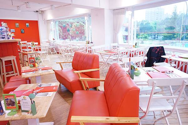 而客桌都是純白的色系,搭配桌上紅綠色的餐墊相當契合。